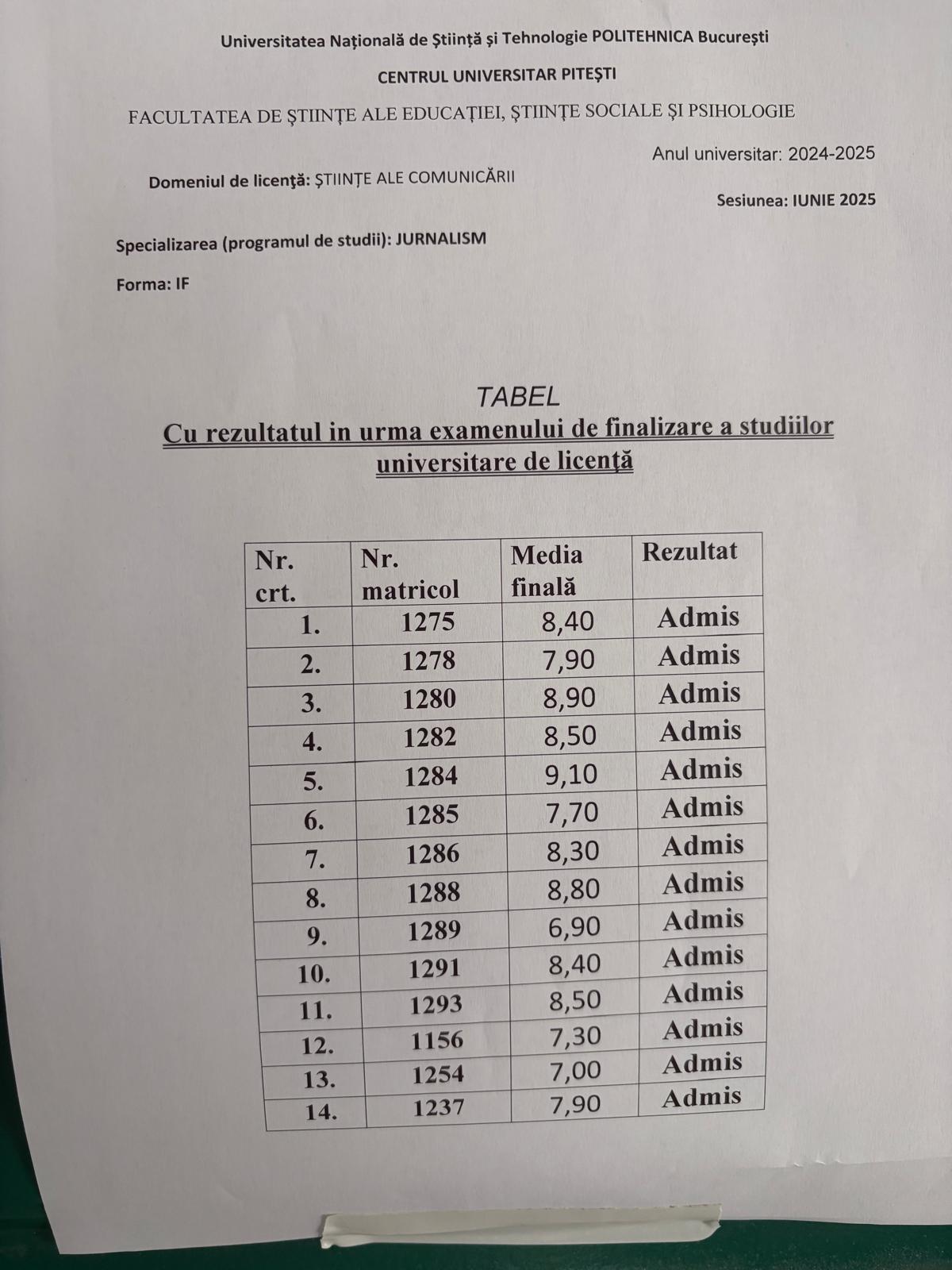 REZULTATE FINALE EXAMEN LICENȚĂ