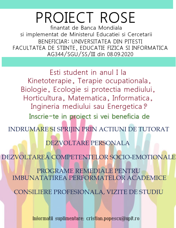Obiectivul general: elaborarea si implementarea unui program educational integrat pentru sprijinirea a 100 de studenți înmatriculați in primul an de studii la programele de licenta din grupul tinta din cadrul FSEFI, care sunt expuși riscului de abandon, aparținând cu precădere grupurilor dezavantajate, in vederea creșterii gradului de retenție în primul an de studii universitare si asigurarii unui proces educational de calitate. Proiectul isi propune integrarea academică şi socio-profesională a studenţilor care sa le permita o mai buna adaptare in mediul academic si o crestere a promovabilitatii.