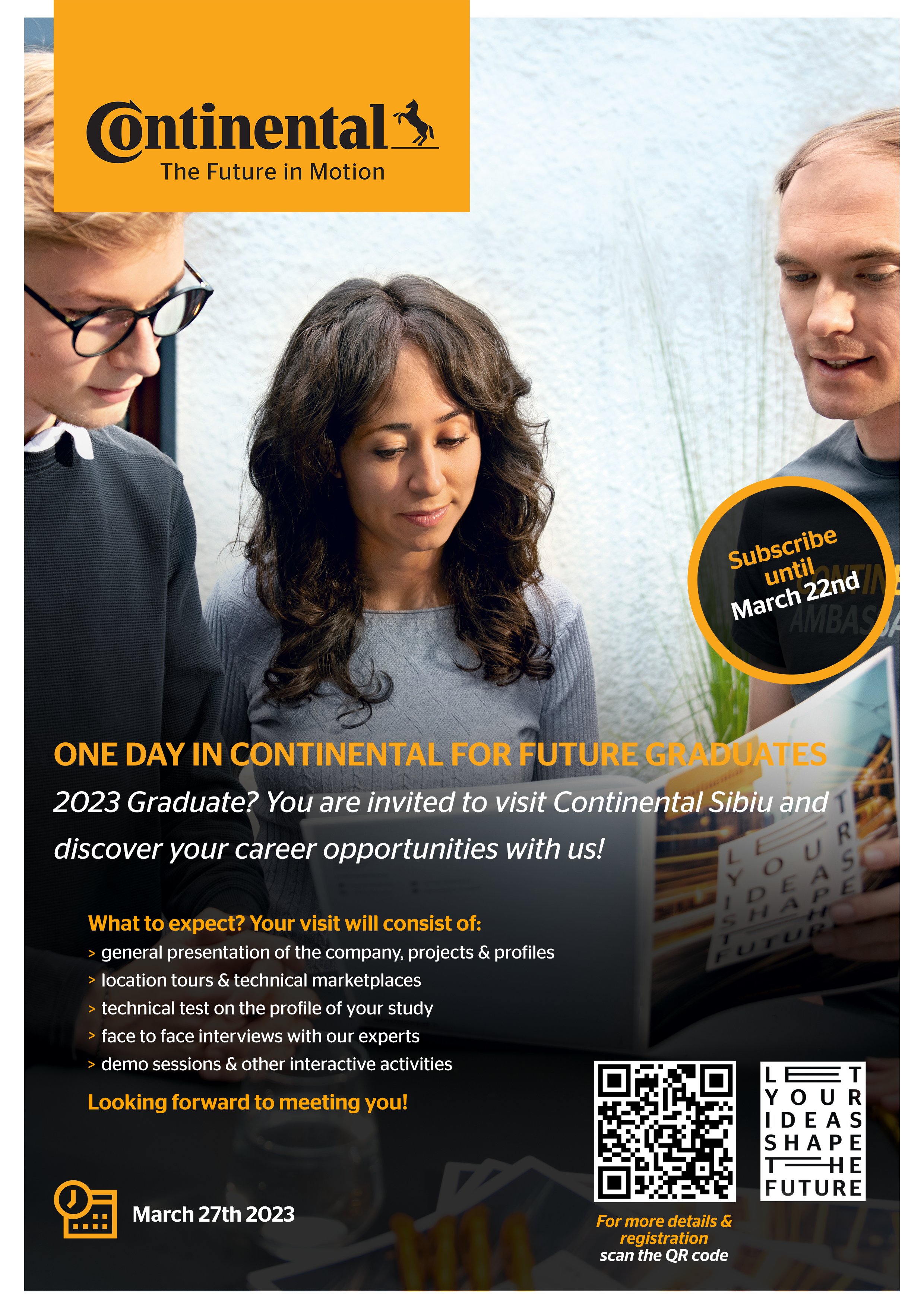 Stimați studenți, luni 27 martie, începând cu orele 07.30, firma Continental Sibiu vă invită într-o vizită de recrutare la sediu companiei din Sibiu.