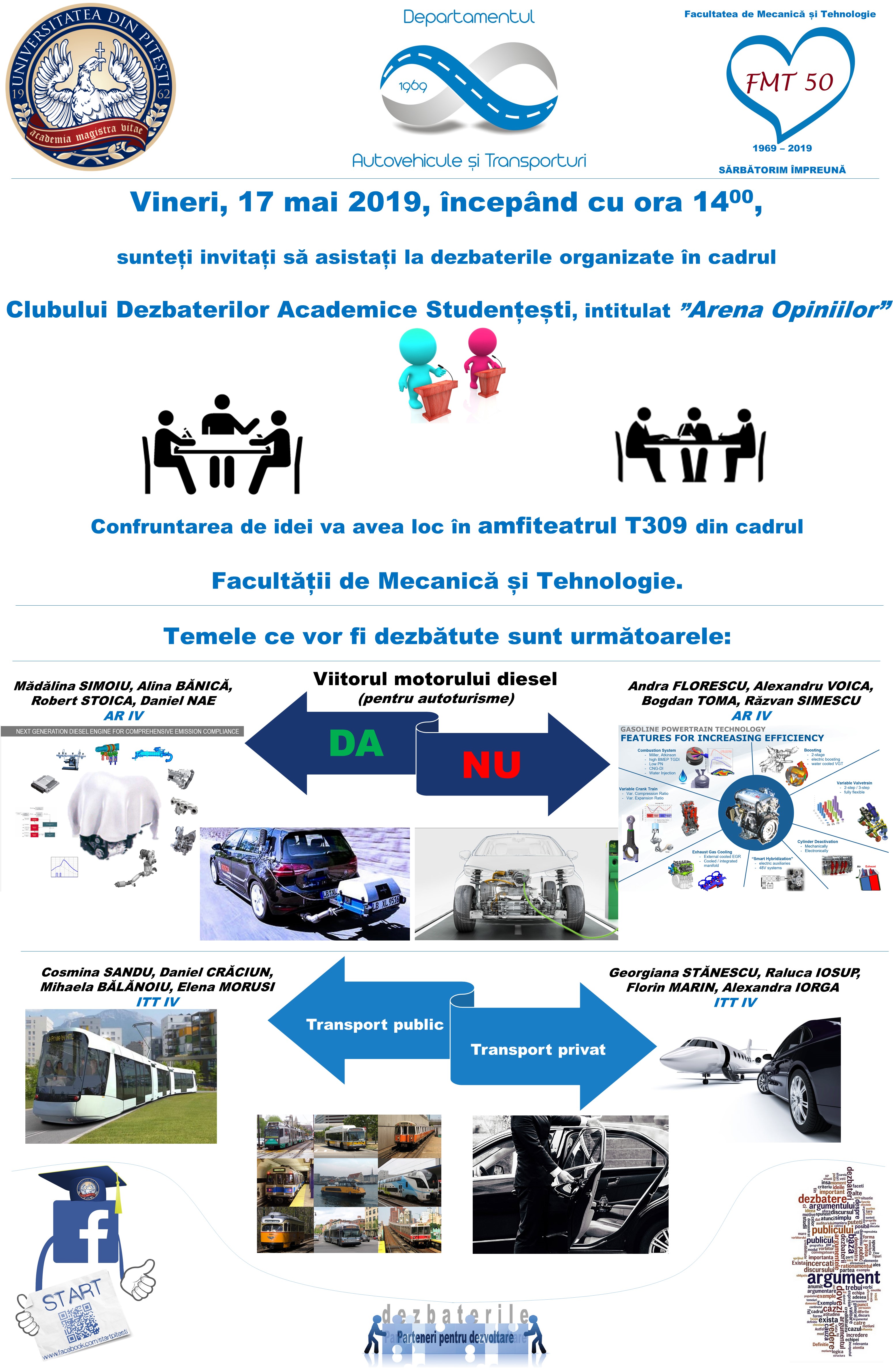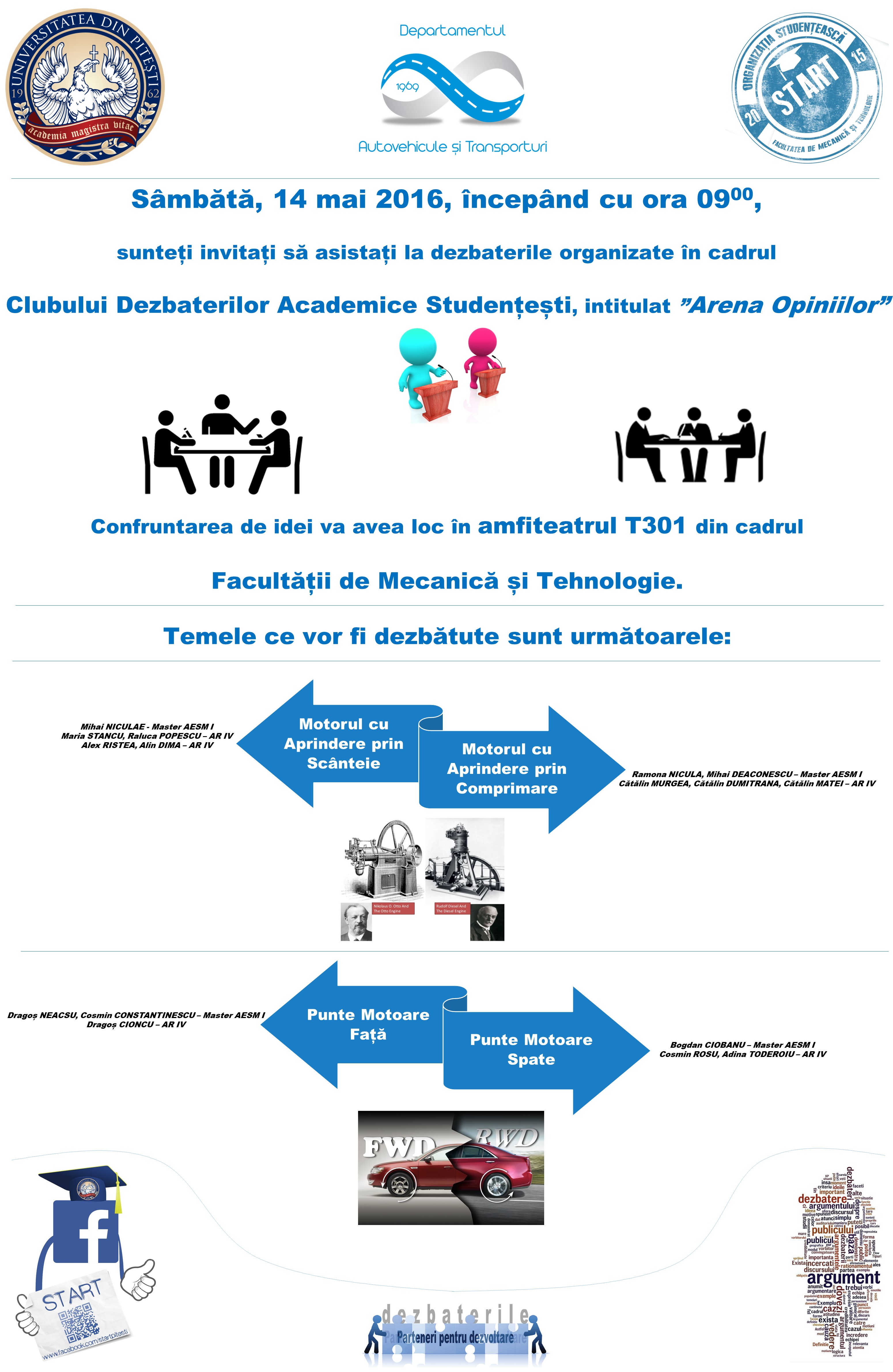Începând cu anul 2015, departamentul Autovehicule și Transporturi din cadrul Facultății de Mecanică și Tehnologie a Universității din Pitești organizează periodic CLUBUL DE DEZBATERI ACADEMICE STUDENȚEȘTI, intitulat ARENA OPINIILOR.