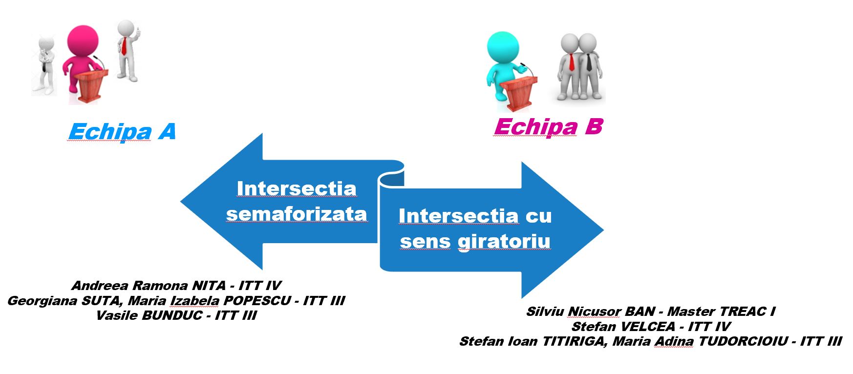 Intersecții semaforizate (Andreea NITA, Georgiana SUTA, Izabela POPESCU, Vasile BUNDUC) Intersecții cu sens giratoriu (Silviu BAN, Stefan VELCEA, Ioan TITIRIGA, Adina TUDORCIOIU) |