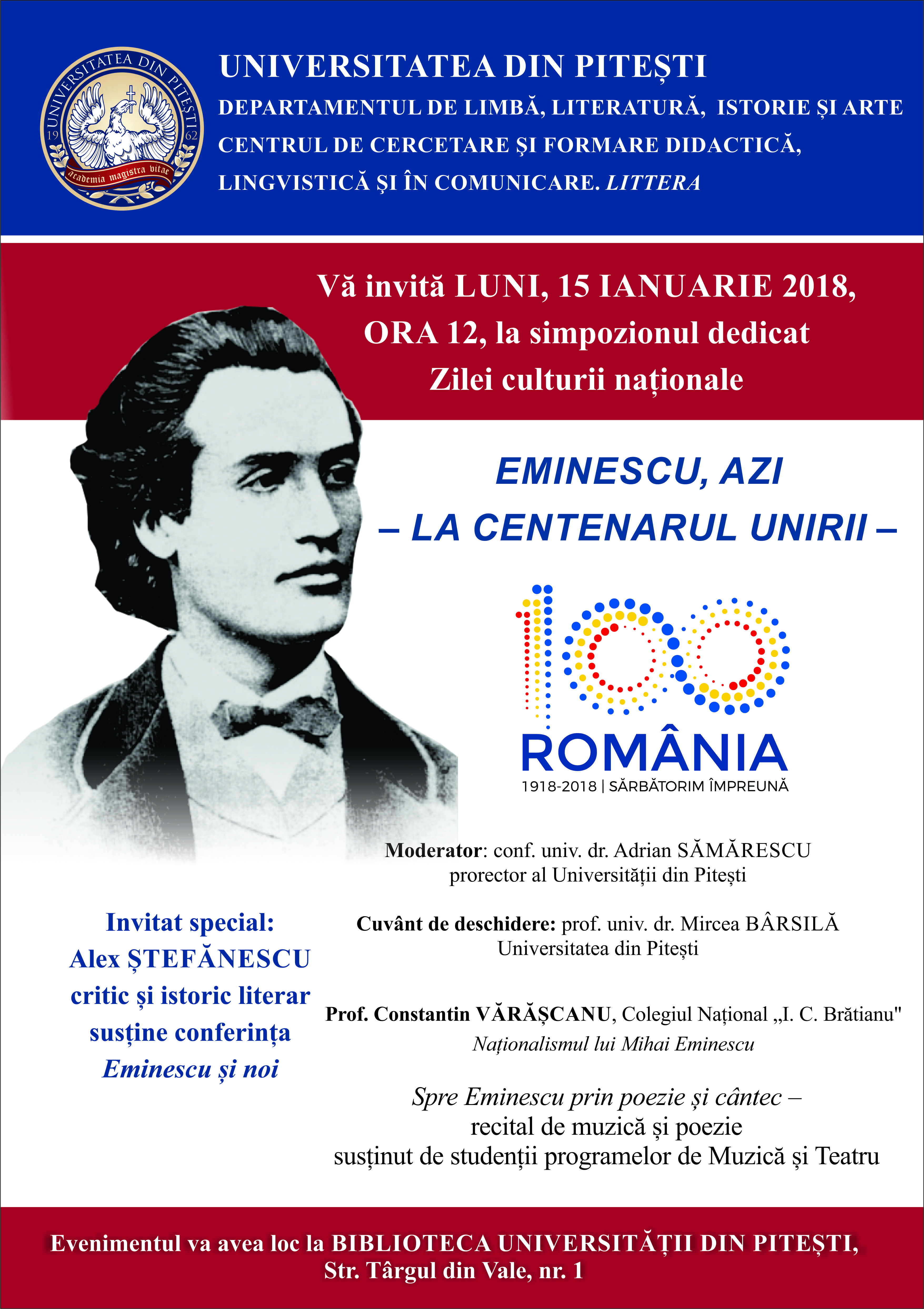 Simpozionul Eminescu, azi - la centenarul Unirii, 15 ianuarie, 2018