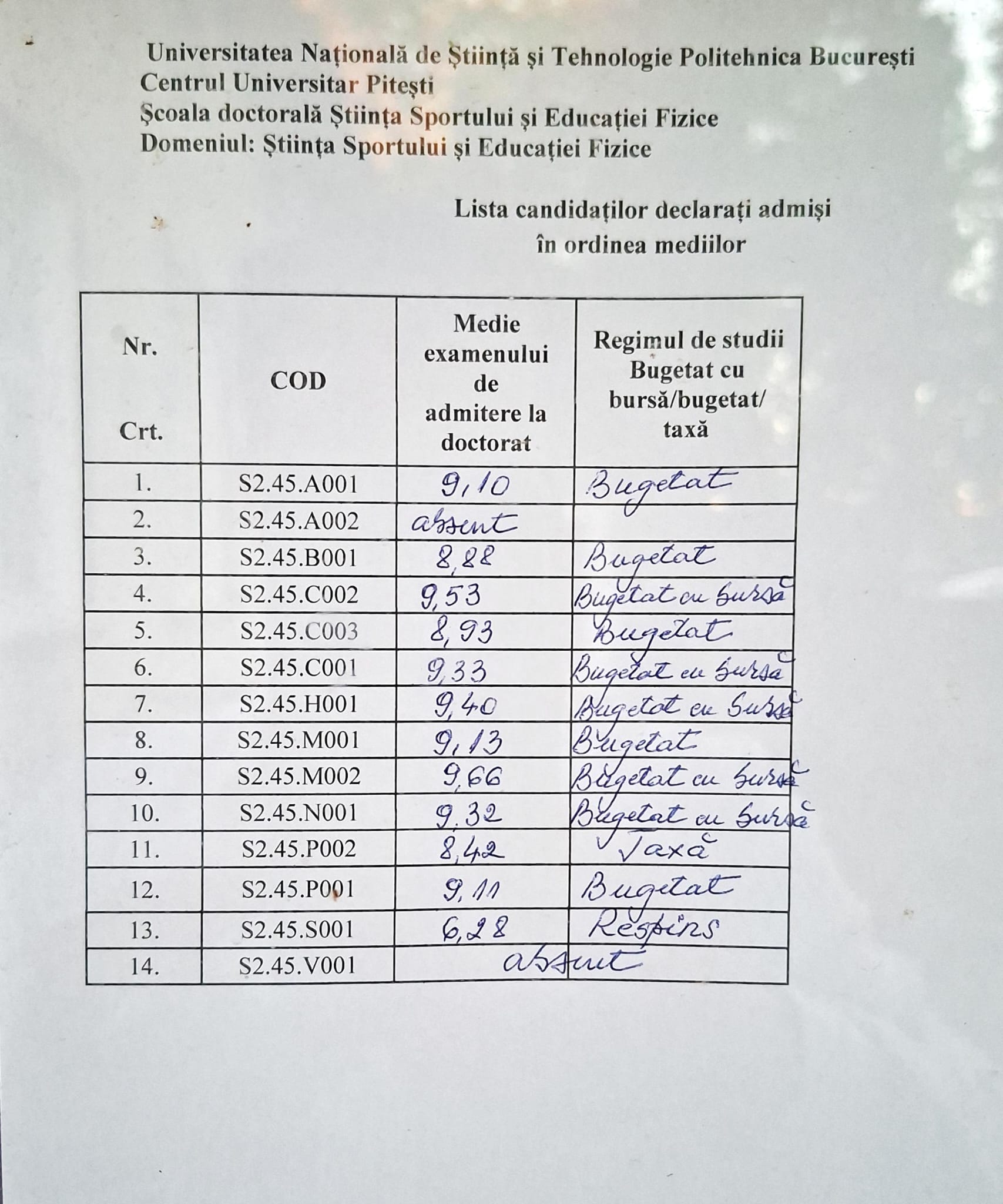Colocviul de admitere se va desfășura la data de 22 SEPTEMBRIE 2024, ORA 9.00, la sediul Școlii doctorale Știința sportului și educației fizice, Aleea Școlii Normale, nr. 7, Pitești.