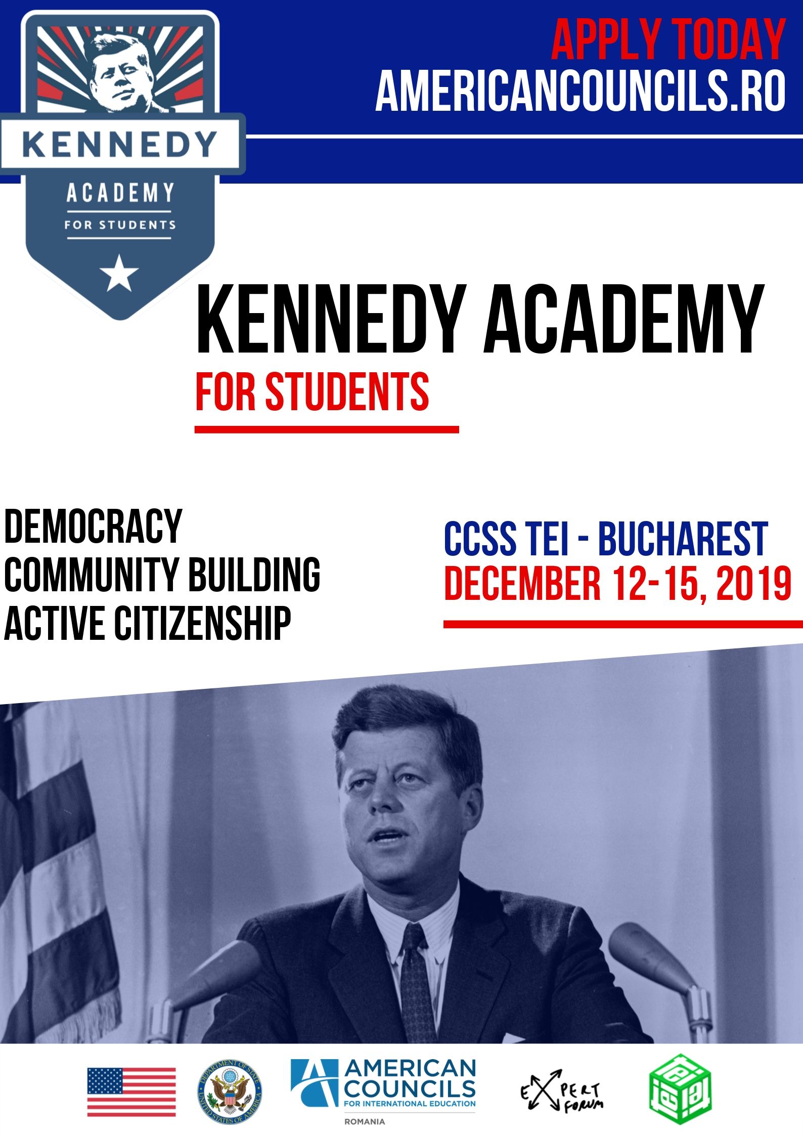 American Councils for International Education anunță deschiderea aplicațiilor pentru Kennedy Academy for Students! Ambasada Statelor Unite în România, alături de Consiliile Americane pentru Educație Internațională, Expert Forum și Complexul Cultural Sportiv Studențesc Tei invită studenții care fac parte dintr-o Asociație Studențească și cu vârsta cuprinsă între 20-27 de ani la a doua ediție a Kennedy Academy for Students.